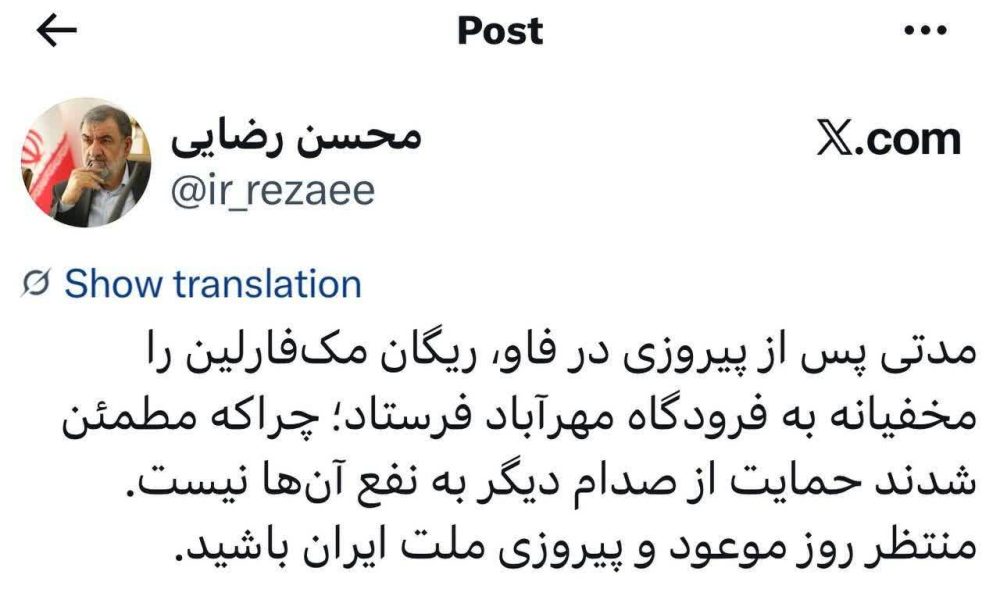 🔻دکتر محسن رضایی در پستی در شبکه اجتماعی ایکس نوشت: 🔹مدتی پس از پیروزی در فاو، ریگان مکفارلین را مخفیانه به فرودگاه مهرآباد فرستاد؛ چراکه مطمئن شدند حمایت از صدام دیگر به نفع آنها نیست. منتظر روز موعود و پیروزی ملت ایران باشید.
